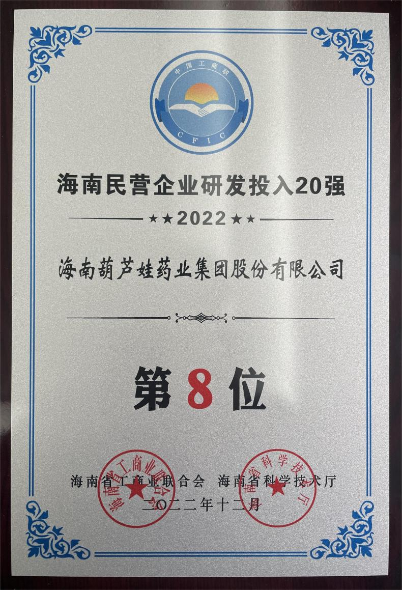 12月23日,2022海南民营企业50强和研发投入20强发布会在海口举行。会上发布了“2022海南民营企业50强”“2022海南民营企业研发投入20强”榜单和分析报告。壹号娱乐药业再次荣登两榜,在海南民营企业50强榜单中位列第25位,较去年上升8位,这也是公司连续三年登榜;在海南民营企业研发投入20强中位列第8位,较去年上升7位。